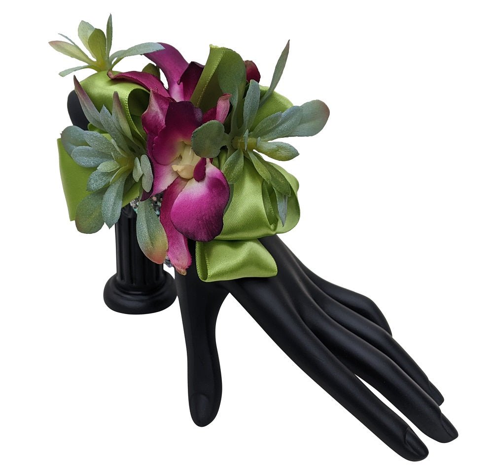 This corsage is crafted from permanent purple orchids and vibrant green succulents. The flowers are accented by a satin ribbon in a complementary shade of green that matches many formal outfits. The corsage is easily held on your wrist with a comfortable elastic band. These faux blooms can withstand your rocking prom dance moves or wedding reception frolics.