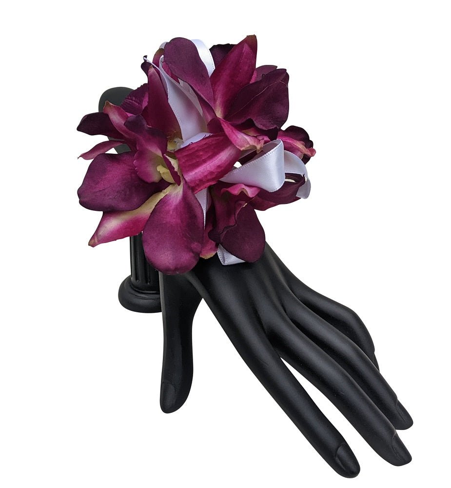 The Purple Orchid Wrist Corsage is an elegant design of faux blooms accented by white satin ribbon. This floral fashion features vibrant colors as long lasting as memories of wedding days and prom nights.