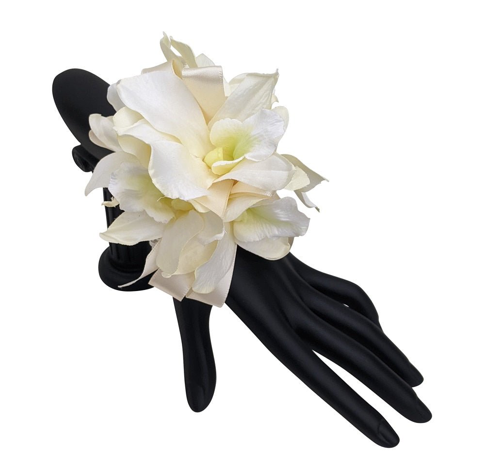 This neutral wrist corsage is made up of faux white orchids accented by white satin ribbon. The White Orchid Wrist Corsage stays securely on the wrist with a comfortable elastic band. Orchids fit in with many styles–from classic to modern–and an all-white design will never clash with your festive ensemble.