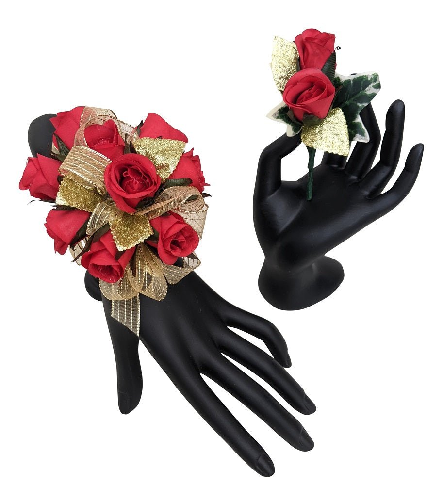 The Red and Gold Silk Flower Combo is a beautiful package of two items that has you covered for your Winter formal. We made festive holiday corsages and boutonnieres with red silk sweetheart roses, variegated artificial holly, golden accents and sheer gold ribbon. You and your date will arrive in style while donning these floral pieces.