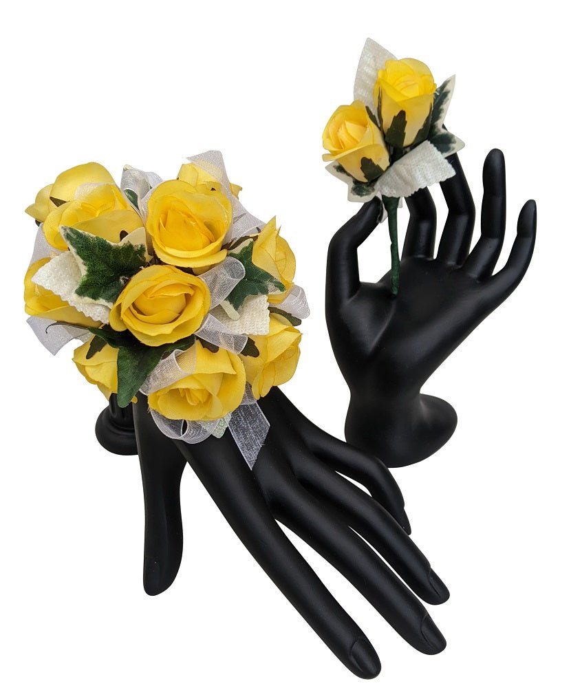The perfect package of silk flowers for your prom, dance or special event.   Includes 1 yellow rose boutonniere and 1 yellow rose wristlet corsage as shown.