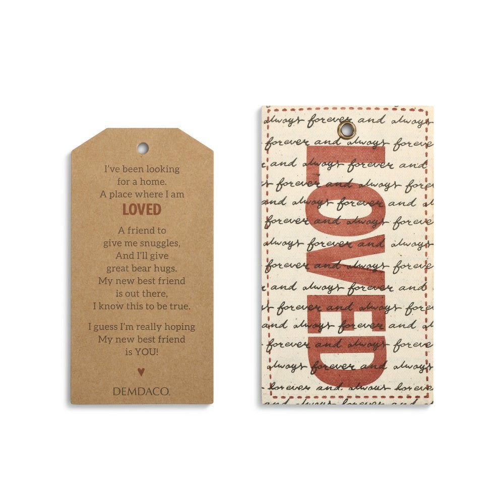 The Loved Bear is an adorable plush toy. It has scruffy fur in a gender-neutral gray color that kids will love to touch. Its ivory feet are printed with the words, “loved forever and always.” This bear brings messages of love with its sweet style and softness. The Loved Bear is the perfect way to show you care anytime someone needs a little love in their life. It comes with a tag reading, “I’ve been looking for a home. A place where I am LOVED, A friend to give me snuggles, And I’ll give great bear hugs. My new best friend is out there, I know this to be true. I guess I’m really hoping, My new best friend is YOU!”