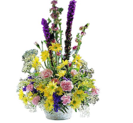 All the colors of spring in a white wicker basket. Flowers include miniature carnations, liatris, pompons, statice, and babies breath. Makes a great gift for any occasion any time of year.