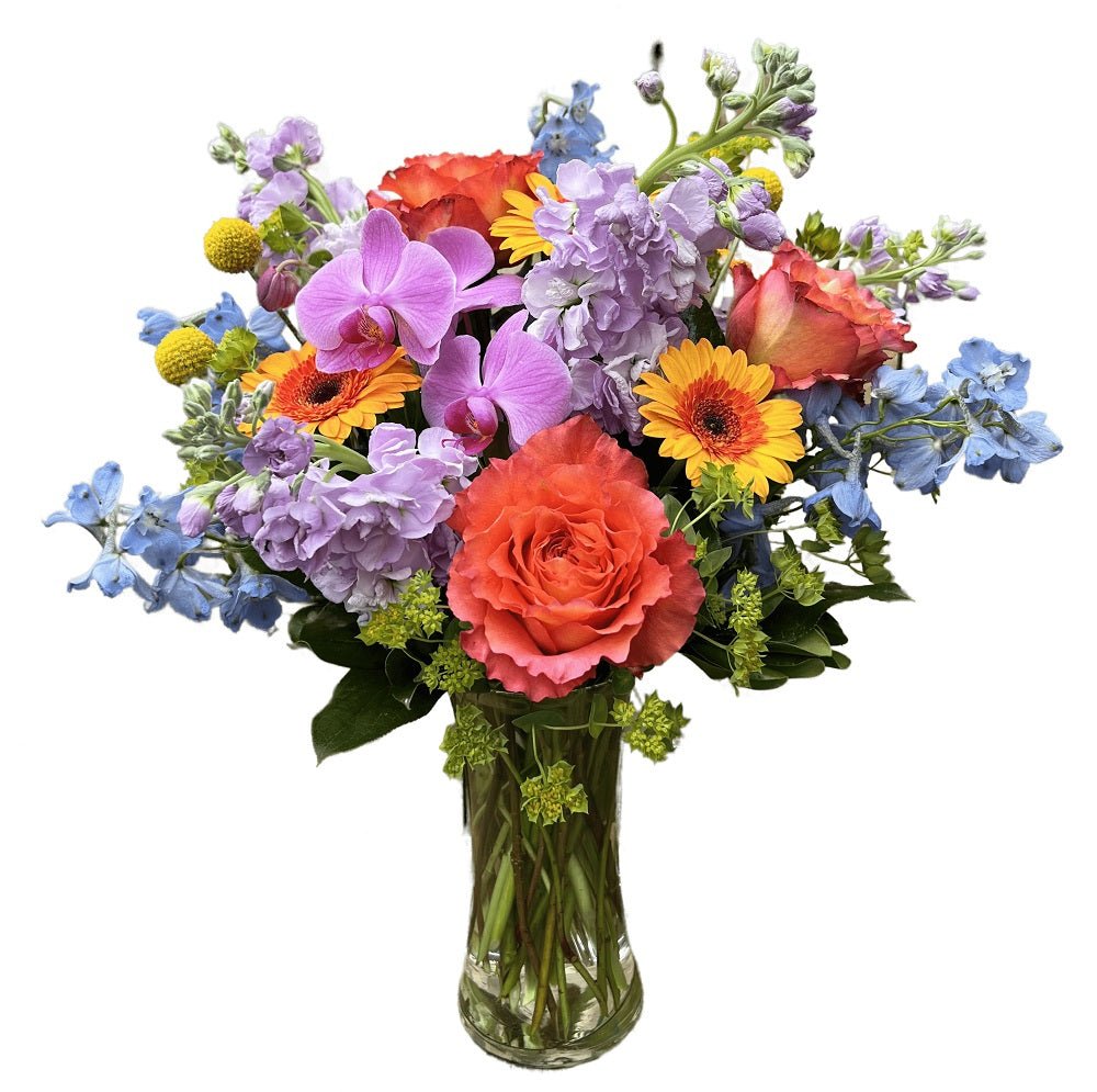 The Norristown Blooms arrangement is a colorful mix of both old and new flower favorites. Check out the bright roses, gerber daisies, stock and delphinium. Then meet the uniquely round craspedia and trailing phalaenopsis orchids. These exciting flowers are arranged in a tall glass vase that would look beautiful on a dining room table or mantle. The fun and funky Norristown Blooms arrangement is a surefire way to add cheer to birthdays, anniversaries, or other joyful occasions.