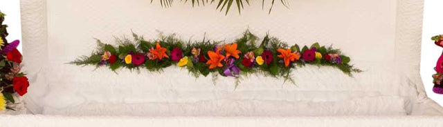 Add some color to the inside of the casket with this garland of assorted vibrant colored flowers. Fits nicely in the back hinge of the casket and is placed by the funeral director.