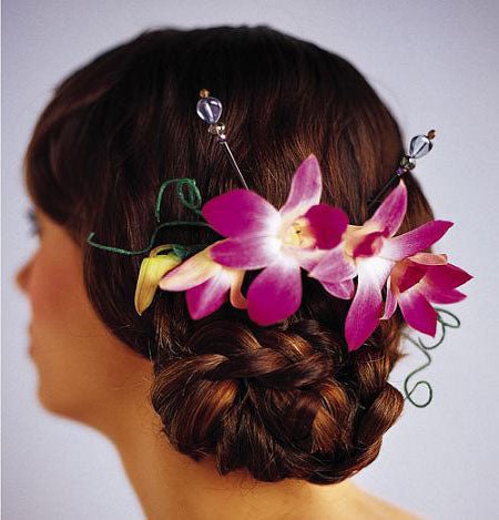 Dress up your up-do with this beautiful piece. Bright and brilliant Dendrobium orchids are combine with fun wire accents to make a breath-taking hair style for your special day.