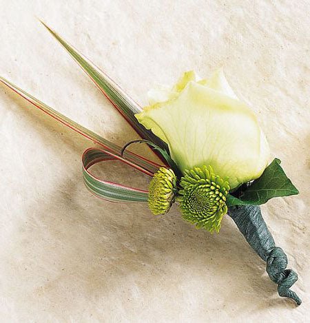 Roses are always traditional for boutonnieres. This one, however, has a little more flair. A beautiful rose in your choice of color with bright and bold green button mums and unique greens make this boutonniere a fun twist on an old favorite.