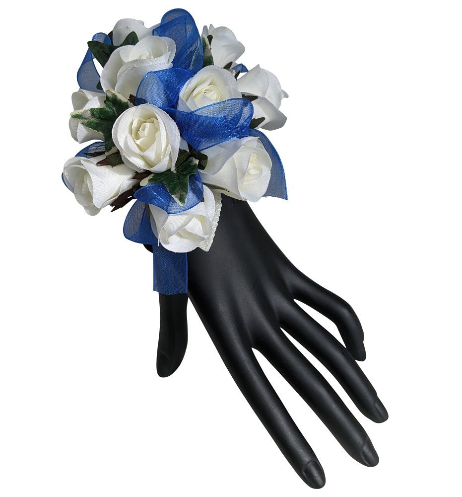 This wrist corsage is made with approximately 10 silk spray roses. The spray roses are accented by sheer, royal blue ribbon.