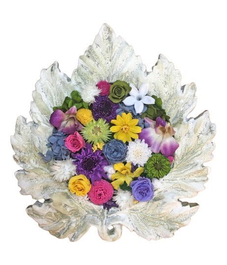 The Maple Leaf encompasses a beautiful bouquet of real preserved flowers, which will retain their softness, pliability, and color for years to come. They are grown en masse on giant farms all over the world, including Equador, Thailand, Japan, China, and Colombia for the sole purpose of preservation. The flowers in this piece include sonia orchids, helichrysum, pee gee hydrangeas, dahlias, cabbage roses, star mums, globe amaranth, zinnias, micro roses, baby’s breath, and jasmine.