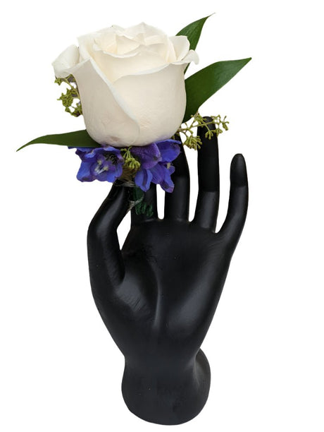 With proper care, our boutonnieres typically stay fresh for 12–18 hours. We condition and wire each bloom to ensure lasting strength and hydration. For the best results, keep your boutonniere cool and wear it just before your photos or event.