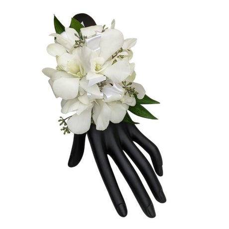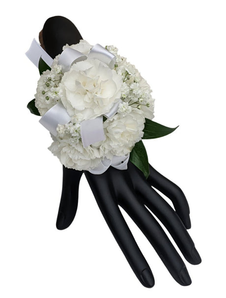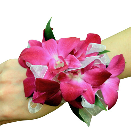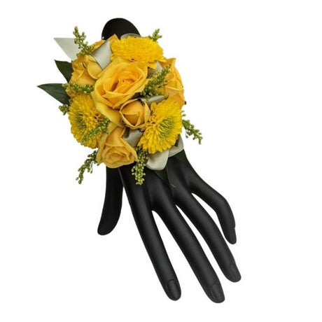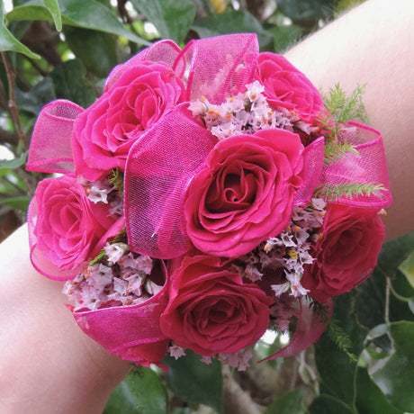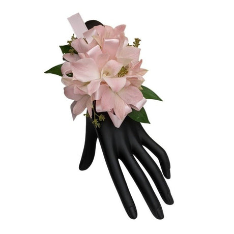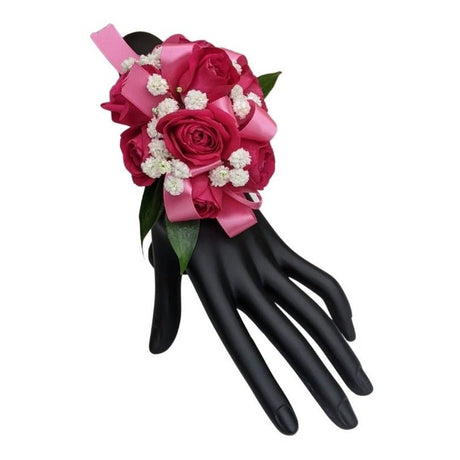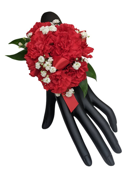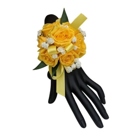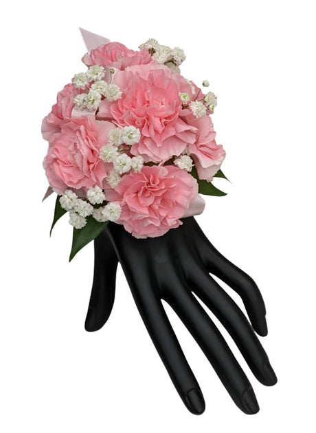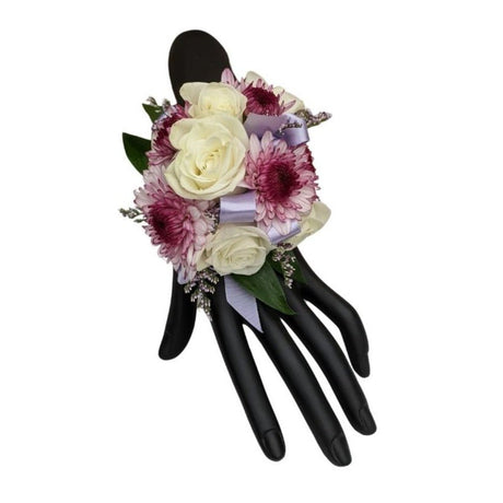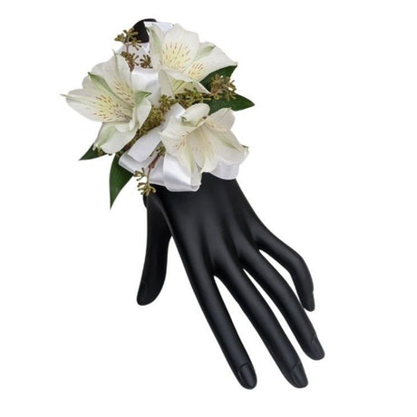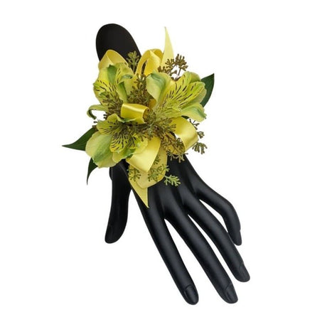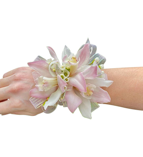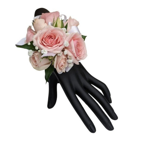 Place the corsage on your non-dominant wrist (most often the left) so it doesn’t interfere with dancing or activities. Make sure it feels secure but not constricting. If needed, we can size the band ahead of time for a comfortable fit.