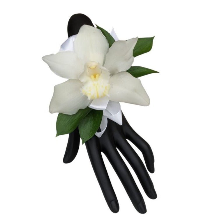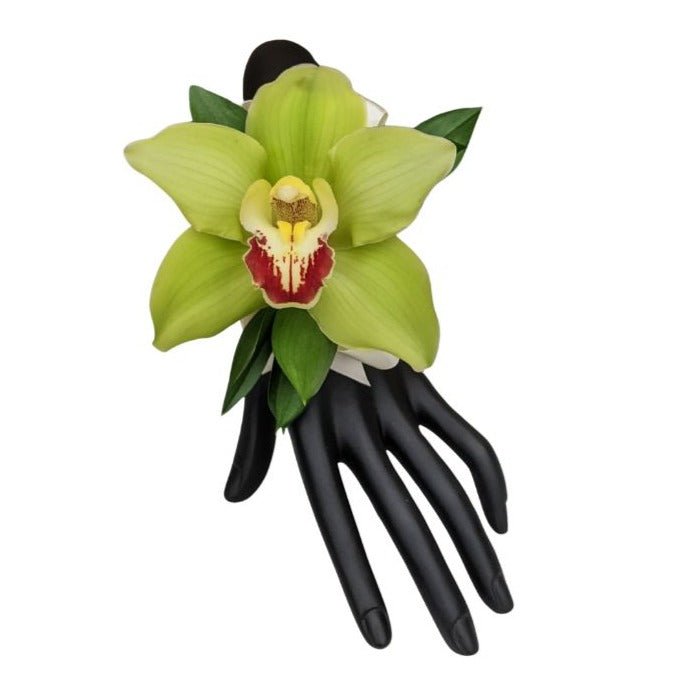 A beautiful Cymbidium orchid is the star of the show in this gorgeous corsage. Accented with delicate greens, this corsage is a popular choice for summer formal events.