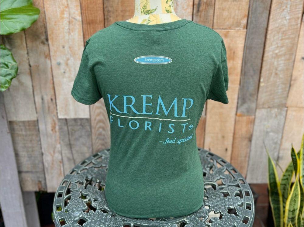 Show your style in our new mossy green v-neck t-shirt. This cozy T is a 60% cotton, 40% polyester blend. Our uniqueKremp "K" is on the upper right and on the back of the shirt you will find the full Kremp Florist logo.