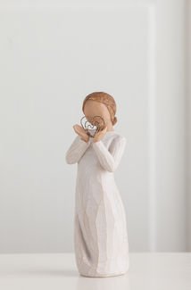 The small metal hearts this angel holds are our favorite part of the figurine. It sparkles and draws your eye as the focal point. We see this as a popular choice for all occasions.