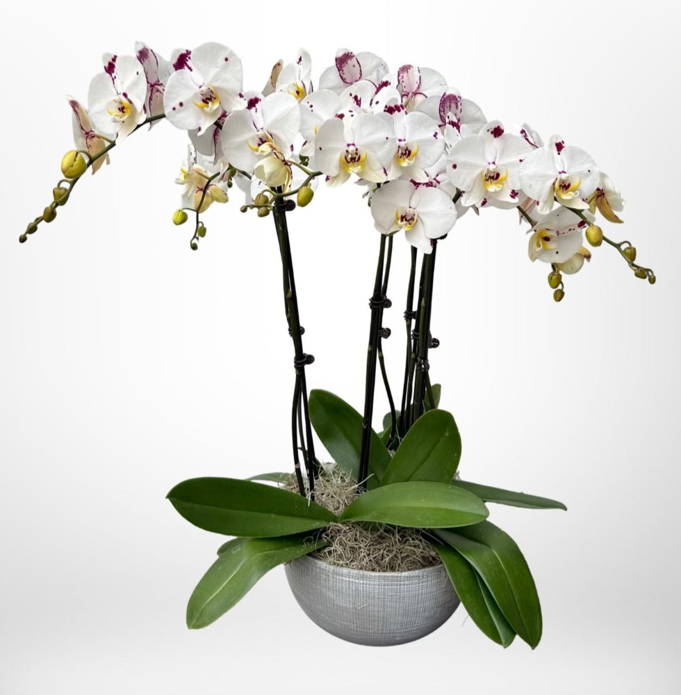 Send your sentiments with style! These beautiful blooming orchid plants provide an upscale look in any environment. This orchid planter arrives in a stylish container accented with beautiful decorative touches such as: