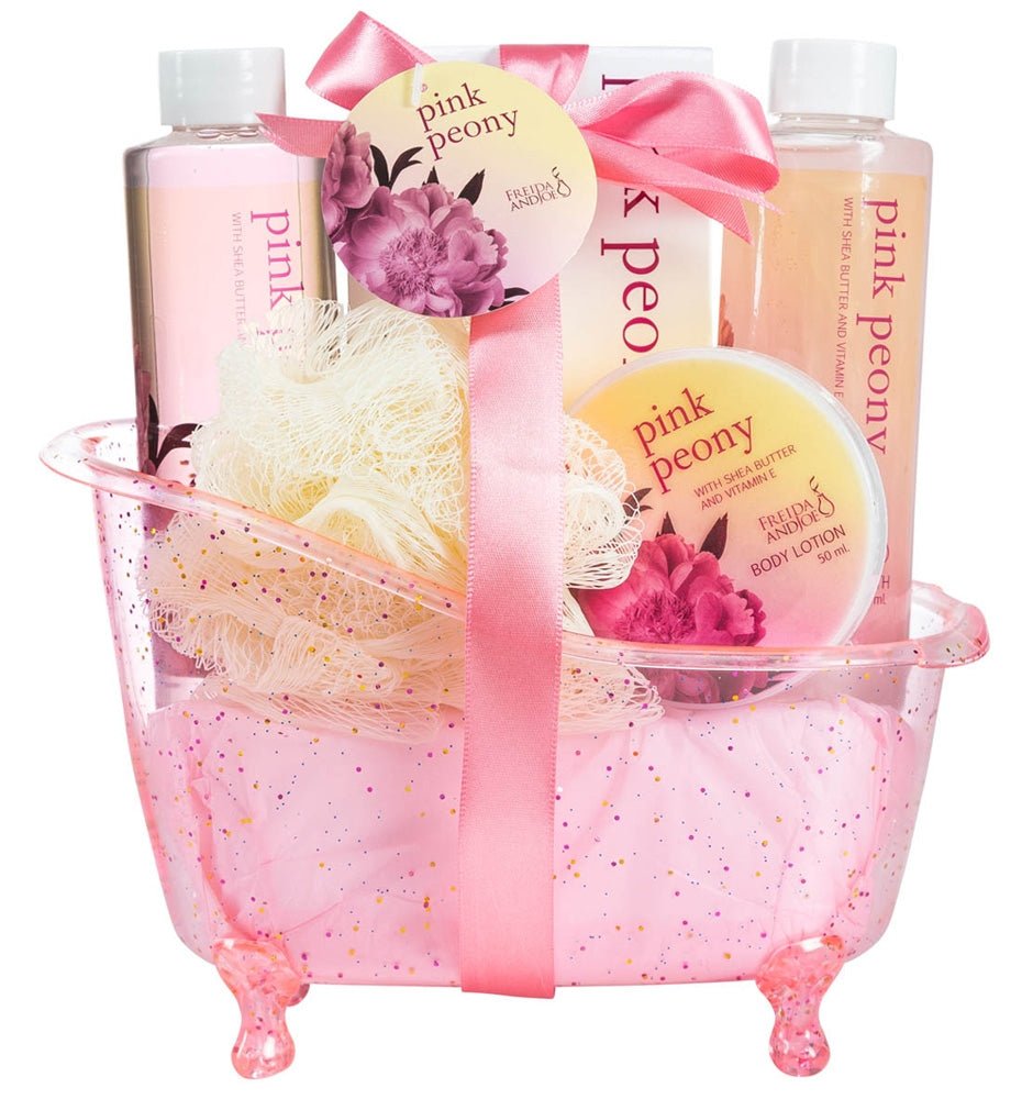 The Pink Peony Spa Tub Gift Set is charming in style and delightful in use. This amazing gift set features an assortment of luxury bath and body products that can be enjoyed individually, but when paired together as a bath time regimen- truly sends your recipient on a miniature vacation to a spring season, outdoor oasis. The scented fragrance of peony, florals, and refreshment provides an aromatic experience that is clean, uplifting, and relaxing. The set includes skin nourishing shower gel, body lotion, bubble bath, bath salts and bath scrubby puff. The perfect set to ensure your recipient has everything he or she needs to decompress after a long day, or to start a day with relaxation and rejuvenation. Each product is placed within an adorable, pink bathtub, gift wrapped and paired with a pretty, pink bow. This is the ultimate selection for Valentine's Day and Mother's Day, as well as celebratory occasions like birthdays, anniversaries, and new beginnings!