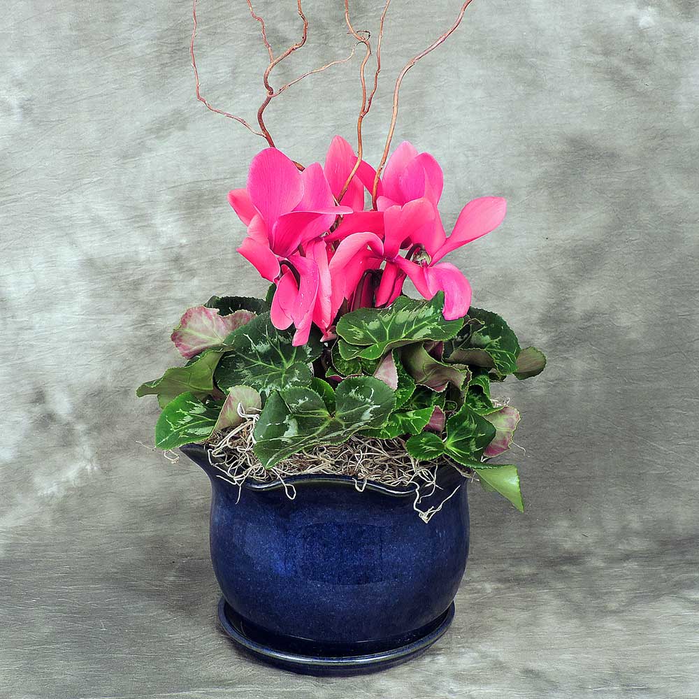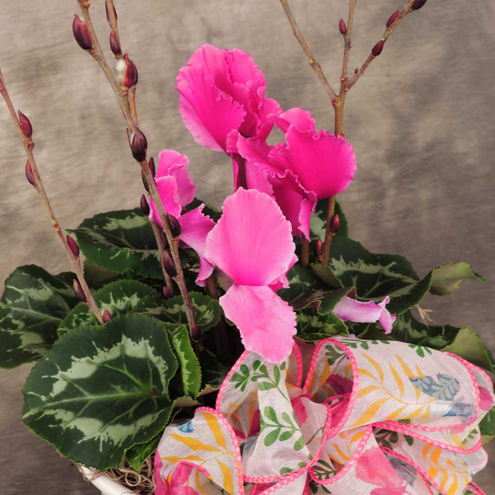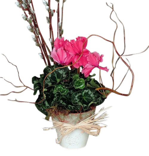 One of the more popular blooming plants is the cyclamen. Our Spring Cyclamen planter arrives in a rustic pot complete with raffia bow and decorative accents such as curly willow and pussy willow. These beautiful plants typically come in pink, purple, white and red. The Springy accents make this planter very attractive and a fancy upgrade from the standard plant in a pot.