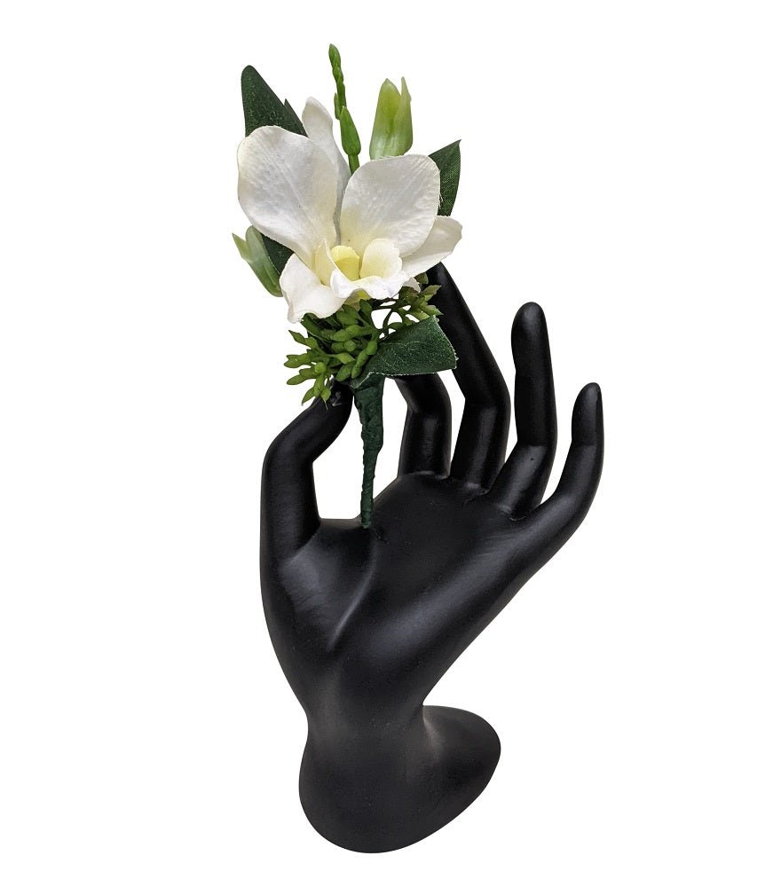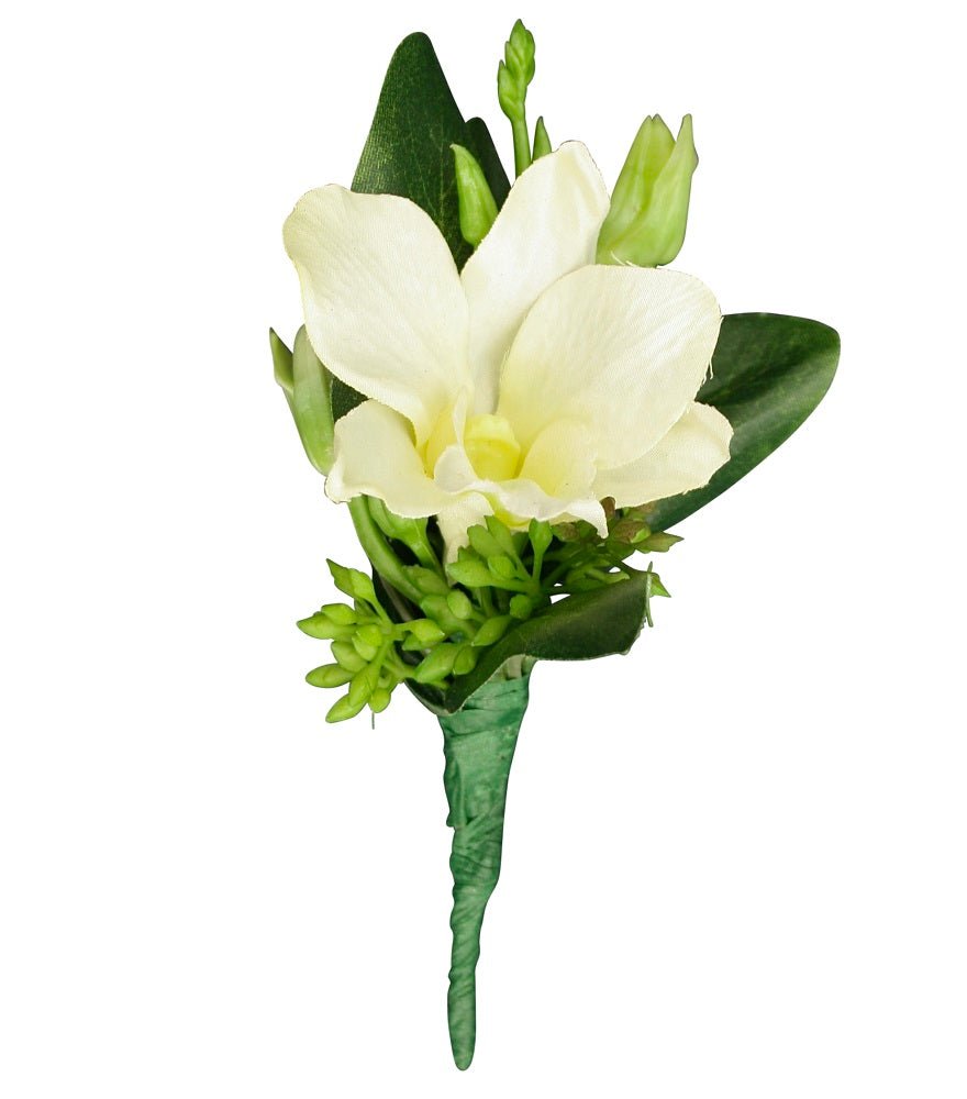 This single white bloom is all you need to complete your wedding or prom attire. The White Orchid Boutonniere is made with a classic white flower that compliments any outfit. Hints of greenery finish this simply elegant orchid boutonniere.