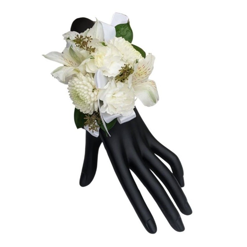 A vision of loveliness. The anticipation corsage is pure-white display of assorted fresh floral blooms including: