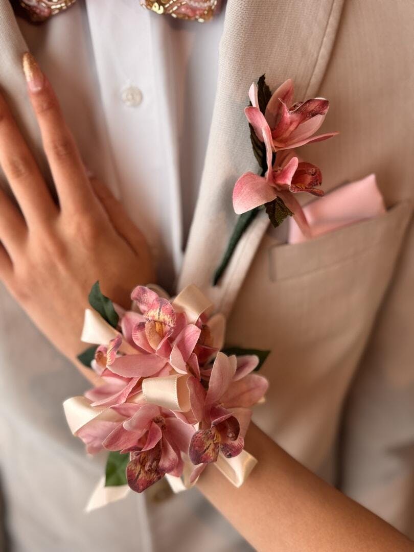The Silk Pink Orchid Corsage is made with approximately 6 orchid blooms. The pink flowers and satin ribbon are designed as a wrist corsage. The matching boutonniere includes a single pink orchid bloom backed by leafy greenery.