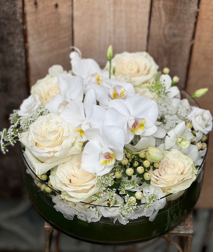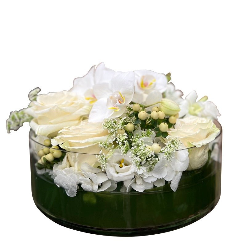 The Glenside Glamour is designed with elegant and sophisticated white flowers. The arrangement includes blooms such as roses, hypericum berries, hydrangea, and other white flowers. The design is completed by a stem of stunning, white phalaenopsis orchid blooms. These premium flowers are designed in a low and compact style, just peeking out of the modern glass cylinder that is lined with a green leaf. The Glenside Glamour is a timeless and sophisticated arrangement that is appropriate for any occasion.