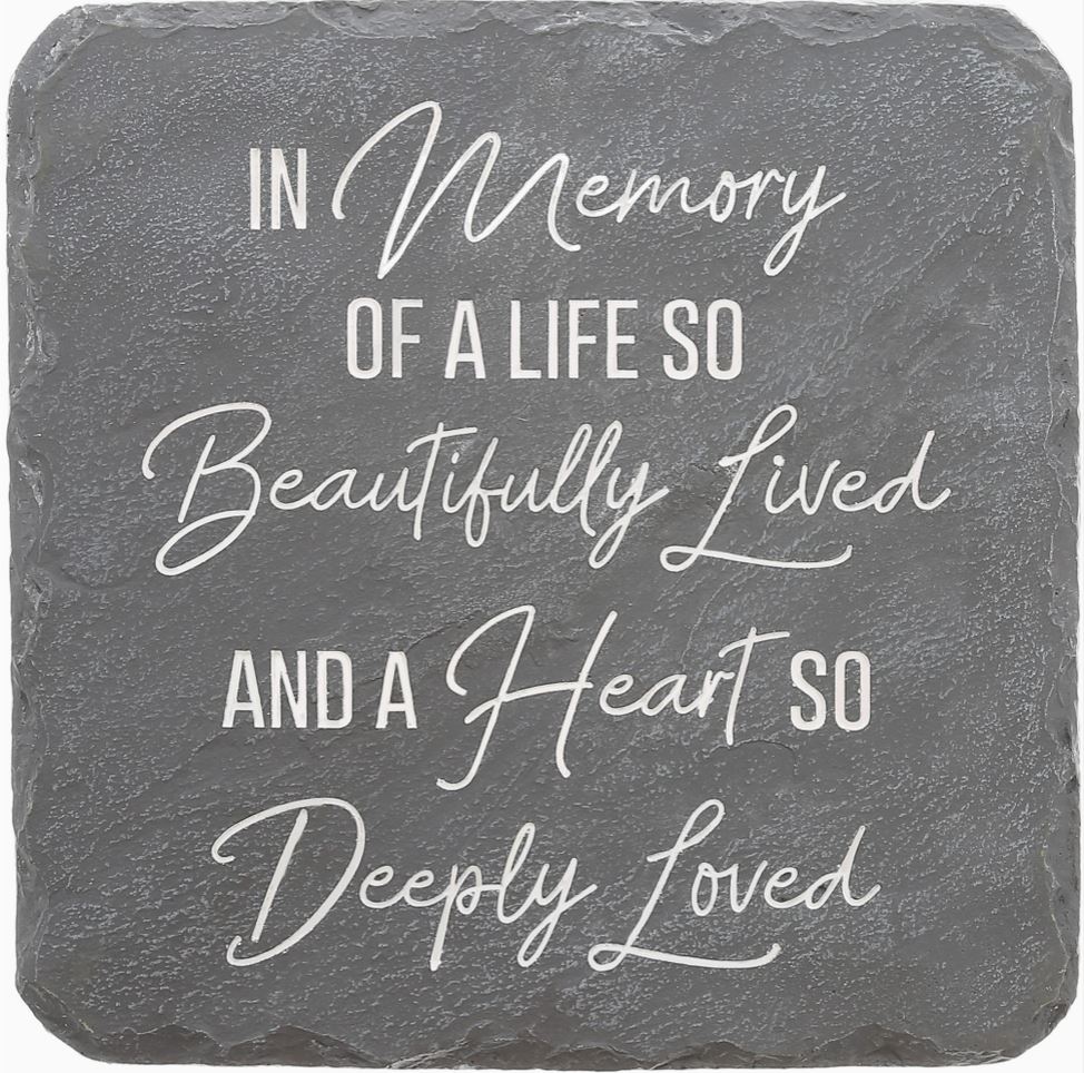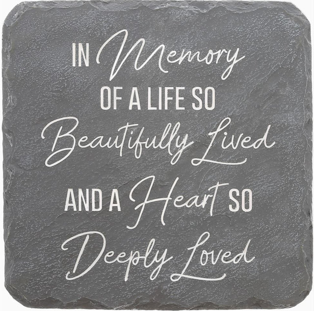 The In Memory Garden Stone is a square, dark gray stepping stone. It is made of fiber cement that is durable, weather resistant, and easy to clean with water. Textured edges give the realistic appearance of stone, and the stone is scripted with the phrase: “In Memory of a Life so Beautifully Lived and a Heart so Deeply Loved.” The In Memory Garden Stone can be displayed in a garden bed, along a garden path, or even indoors. Give the In Memory Garden Stone to the one who finds comfort in nature in their time of need.