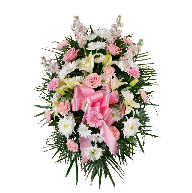 The Pink and White Standing Spray holds pretty petals, topped with a satin ribbon. The feminine spray includes flowers like lilies, carnations, and roses that are artfully designed on a tall easel. The Pink and White Standing Spray is classic, traditional, and a touching tribute.