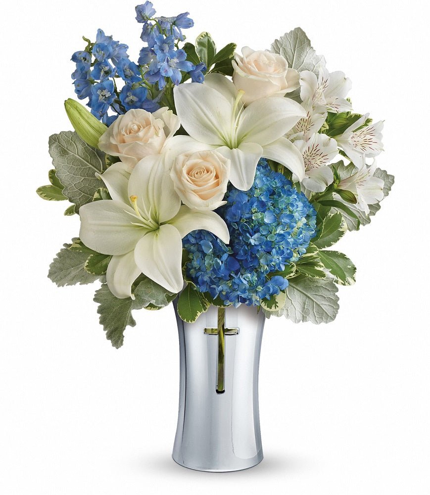 Blue and white flowers are one of the most popular choices for sympathy arrangements. The bright hydrangea and fresh lilies give Skies of Remembrance the crisp look of a blue sky. Skies of Remembrance is made with flowers such as roses, lilies, hydrangea, delphinium, and alstroemeria. The flowers are designed in a silver vase with a cross shaped cutout. The cross vase is a comforting sign of faith, whether you choose to have Skies of Remembrance delivered to a funeral service to the recipient’s home.