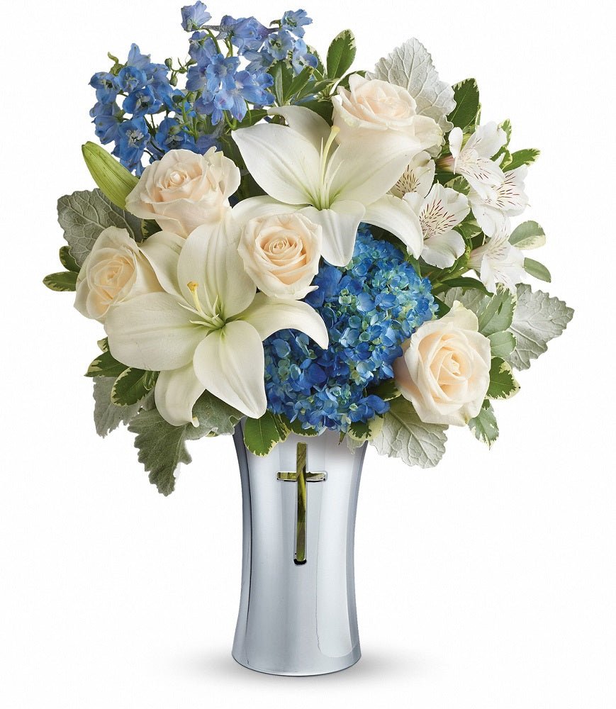 Skies of Remembrance Bouquet has the refreshing colors of a blue sky. Made with roses and lilies, Skies of Remembrance is designed in a silver vase with a cross shaped cutout. This faithful arrangement can be delivered to funeral services or homes.