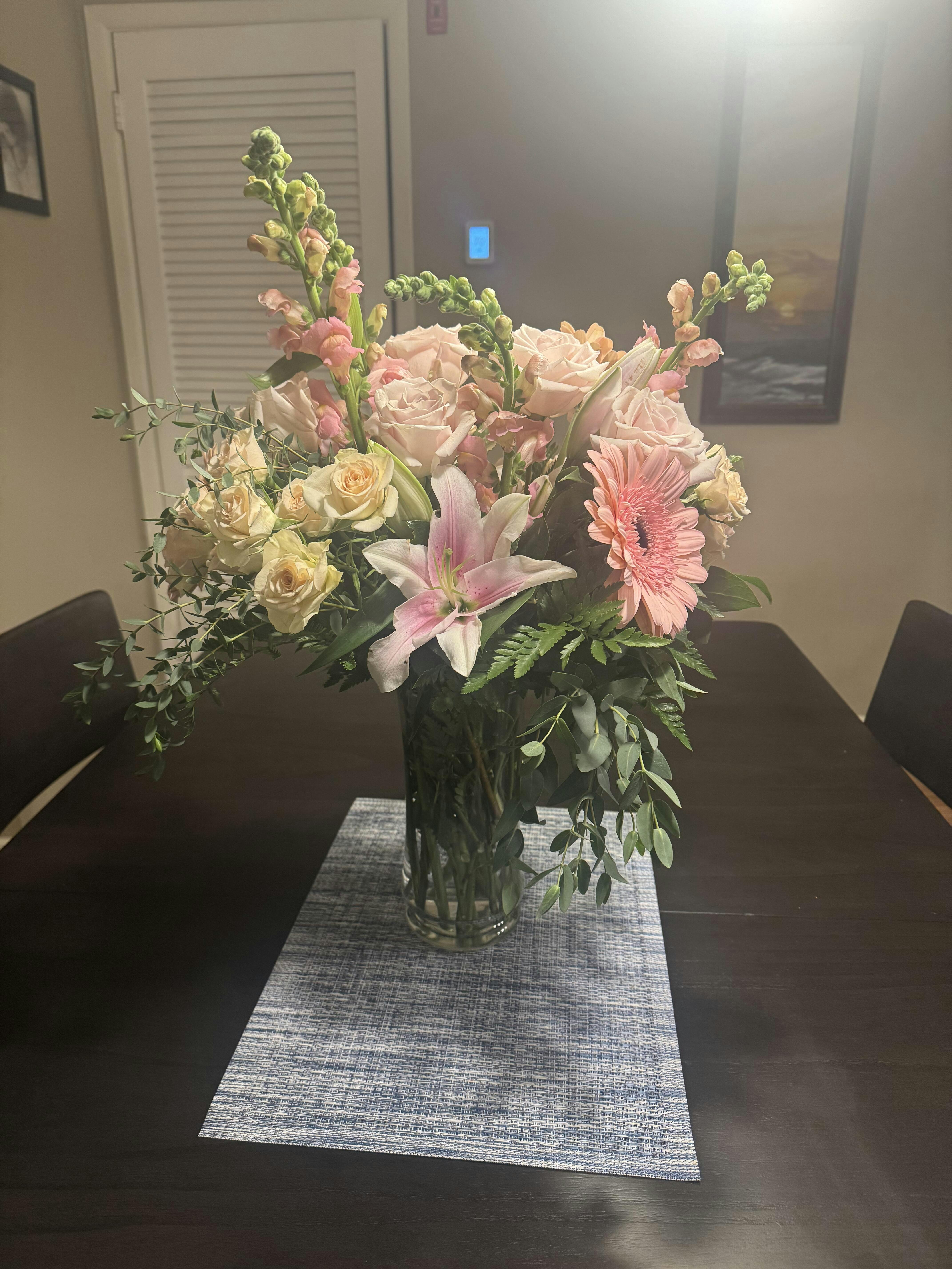 Being completely honest, we were disappointed in the overall resiliency of this bouquet. It lasted 1 day before flowers began to wilt and petals fell off. For the price we were not happy.
