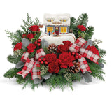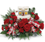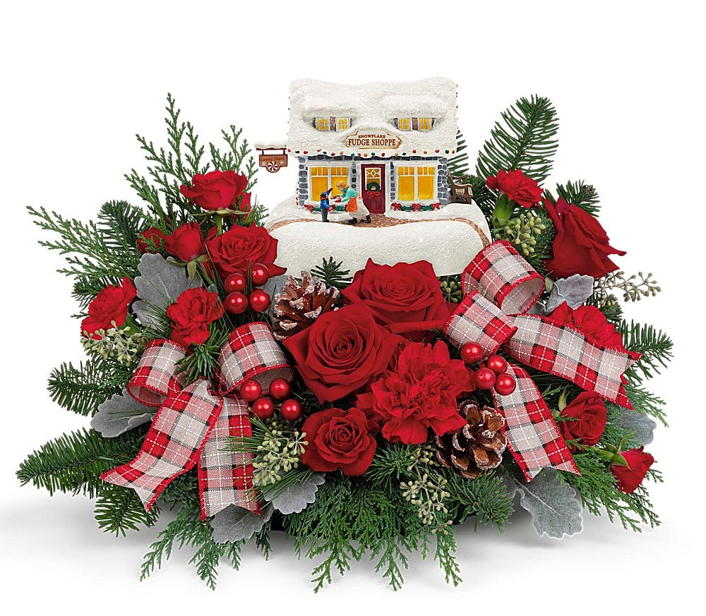 The Thomas Kinkade Sweet Shoppe Bouquet sets a charming winter scene in front of a candy store. A woman and child share a treat outside of the brightly lit Fudge Shoppe. The quaint shop is covered in fresh snow, Christmas lights, and decorations. The Thomas Kinkade Sweet Shoppe Bouquet is a collector’s item that lights up holiday displays for years to come.