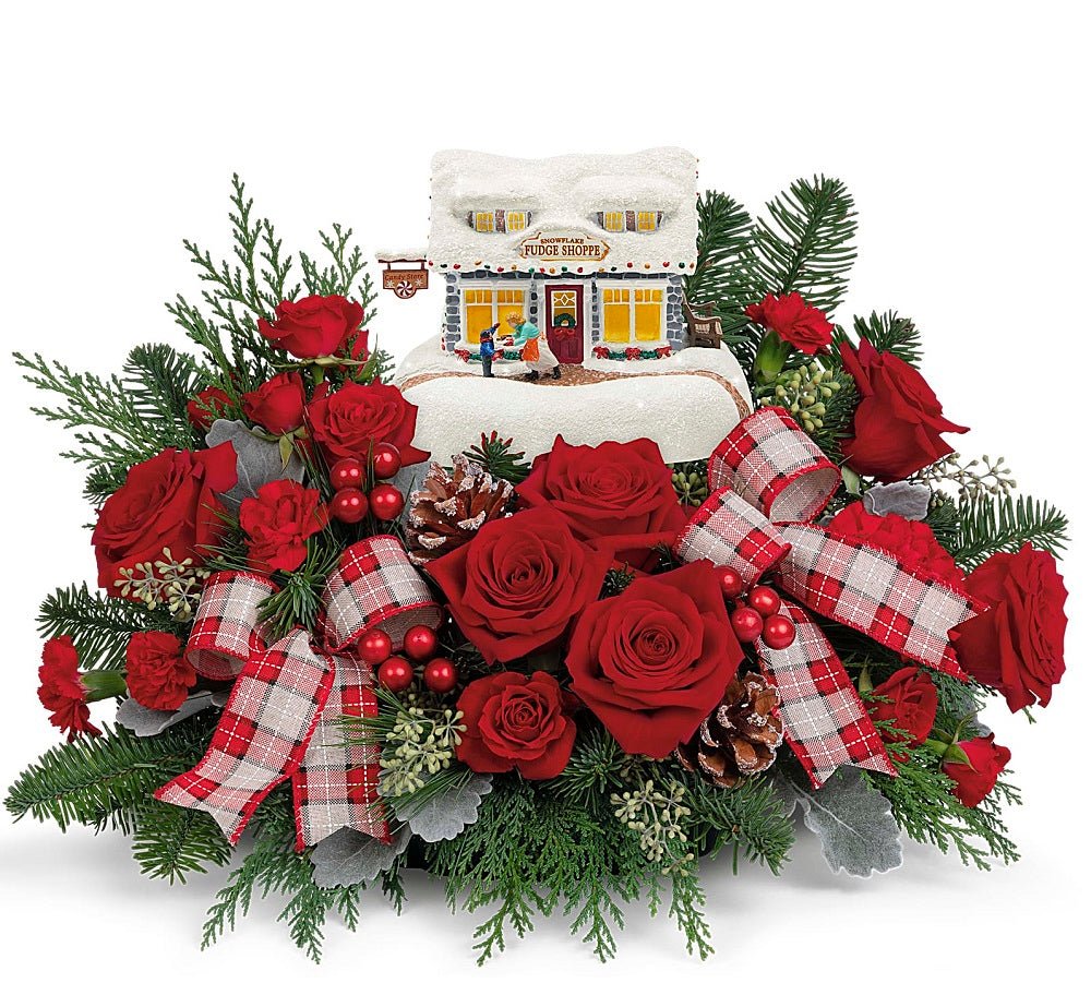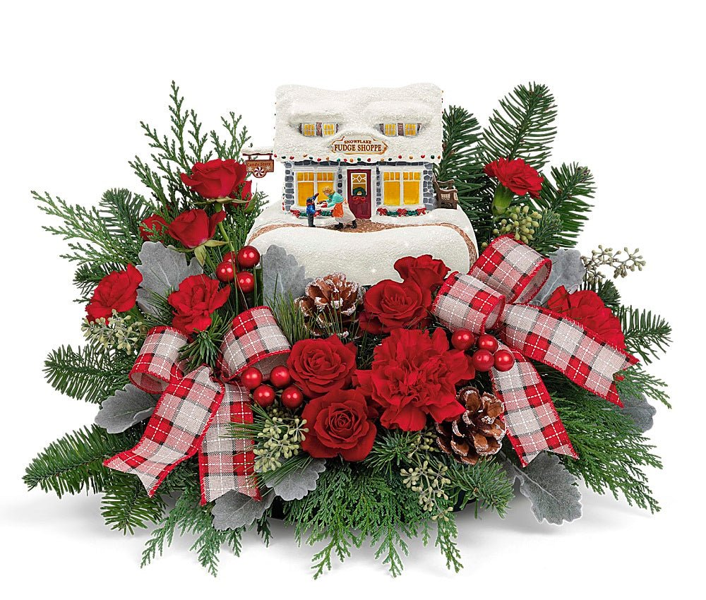 The Thomas Kinkade Sweet Shoppe Bouquet is sure to sweeten your holiday season. The collector's item features an adorable fudge shoppe, decked with Christmas charm.