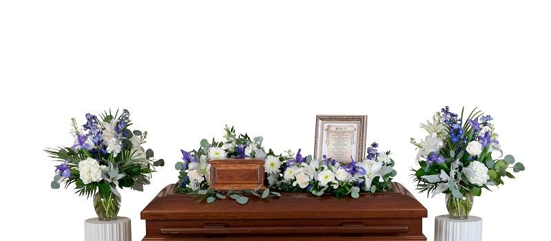 The Blue and White Cremation Package includes all floral items shown, the perfect combination for a cremation tribute. Although flower specifics may change with the seasons, we will use only the freshest varieties in shades of blue and white.