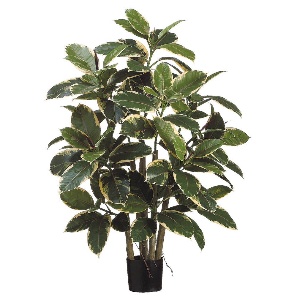 The 39' Rubber Leaf Plant has variegated green and cream leaves in a round black pot.