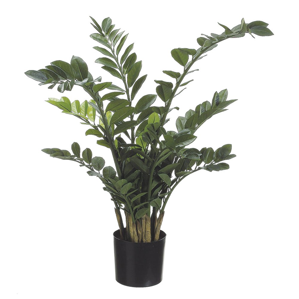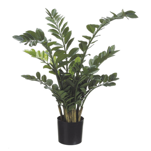 Attractive green leaves line the stems of the artificial Zamioculcas Plant in a plastic pot.