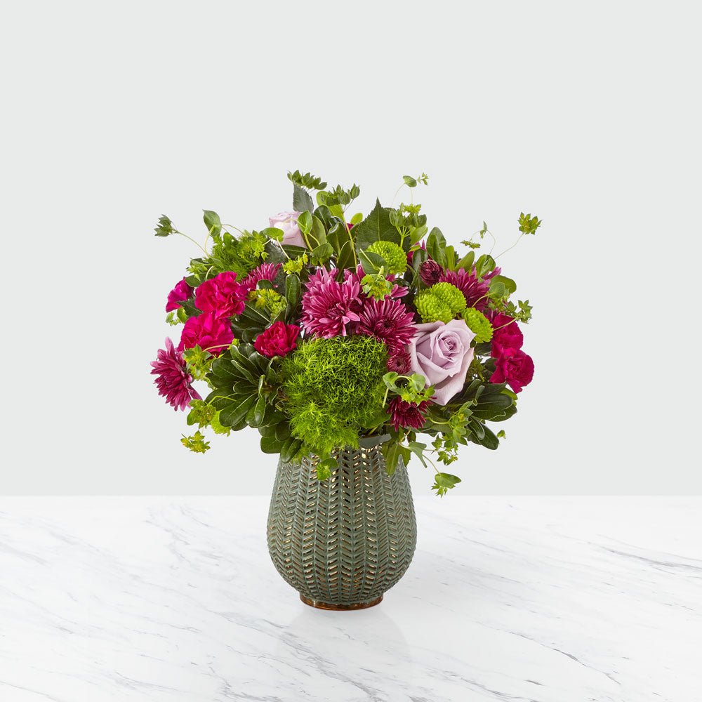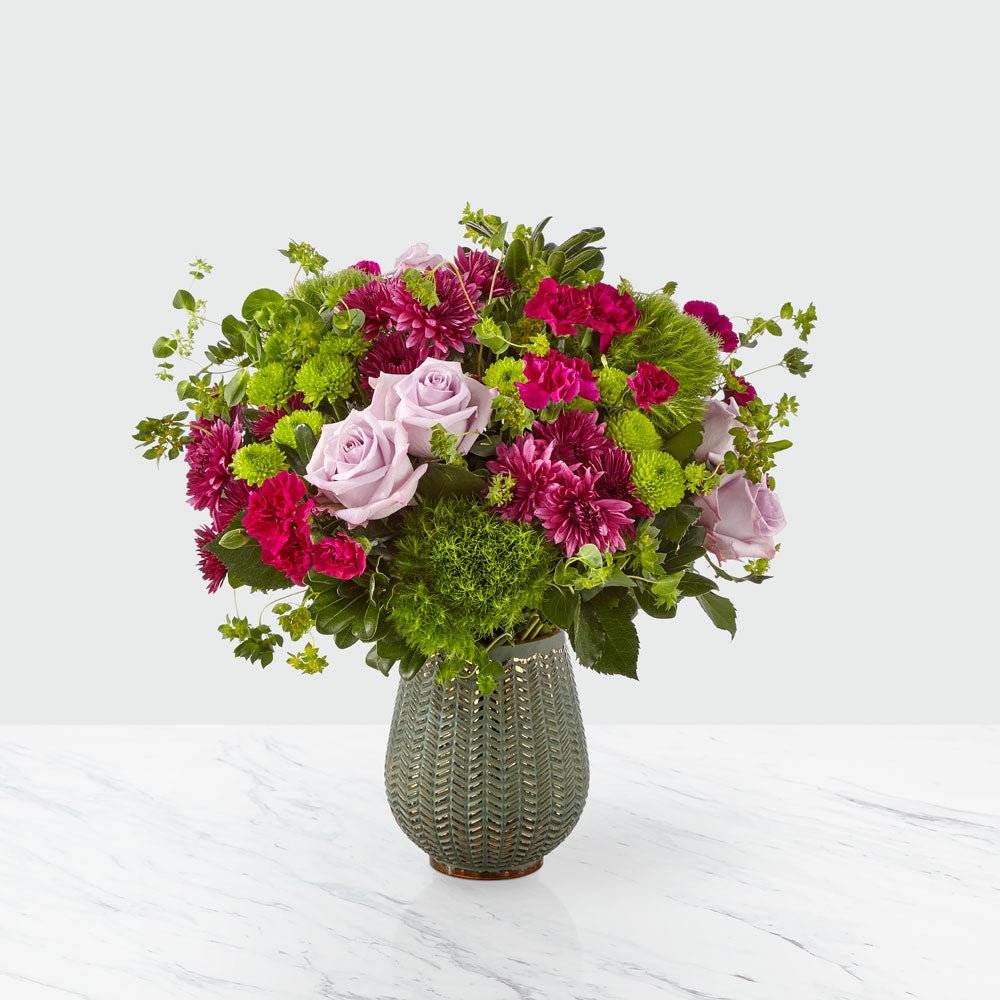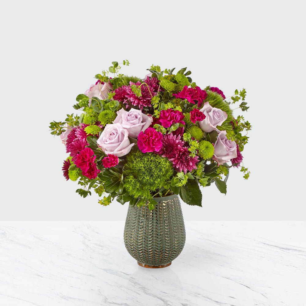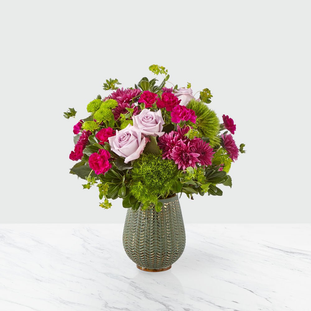 Our Abundance Bouquet is a beautiful blend of lavender roses and bright fuchsia carnations enveloped by vibrant greens. Designed in a light green patterned ceramic vase with gold underlay, this arrangement has class and style. Upgrade to one of the larger sizes for a fuller and more lavish look.