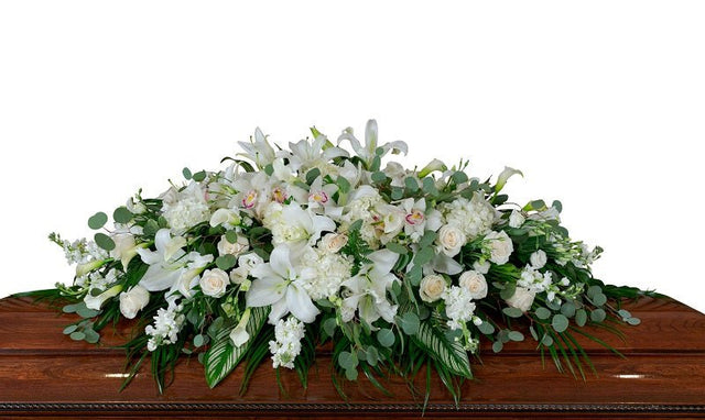 This casket spray can be displayed directly on top of a closed casket or positioned above an open lid of the caskets.
