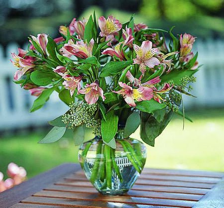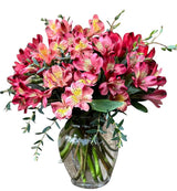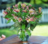A fresh flower arrangement of alstroemeria lilies professionally designed in a decorative clear glass vase. Great for any occasion, these Peruvian lilies can easily last for 2 weeks or longer if cared for properly. A great value!