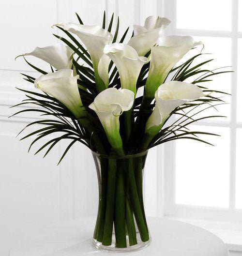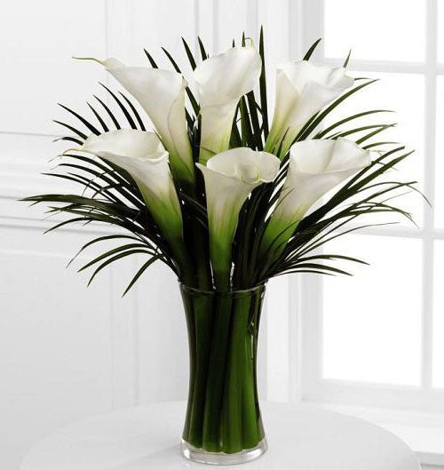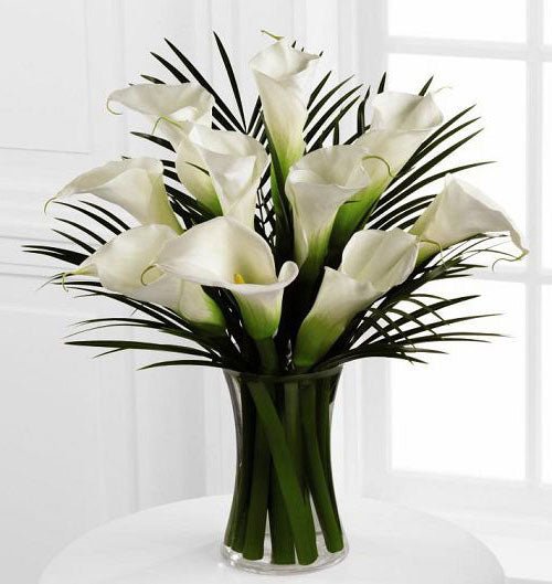 The Always Adored Bouquet is a sophisticated display of sweet serenity. Elegant white calla lilies are simply accented by Phoenix palm leaves to give a look of purity and peace. Seated in a clear glass gathering vase, this bouquet will offer comfort in their time of need.