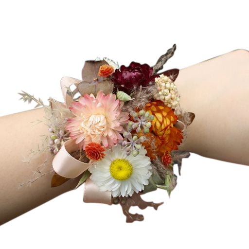 The Amber Boho Dried Flower Corsage is created with unique dried flowers, preserved eucalyptus, and feathery greenery. The flowers’ natural tones make this a colorful yet neutral corsage that compliments many styles. The corsage is finished with elegant satin ribbon and attaches securely to the wrist with an elastic band. This corsage has all the best of boho–it is unique, fashionable, effortless, and carefree. Order today for your next formal event as this dried corsage is everlasting.