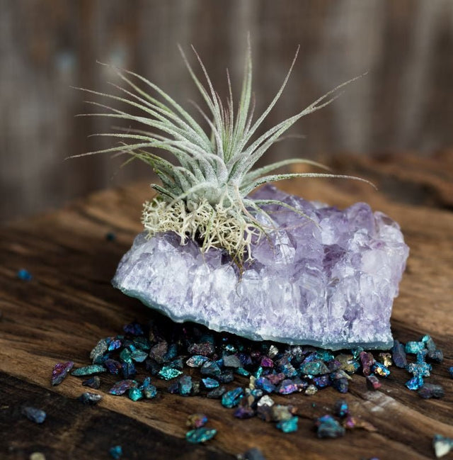 Our Amethyst Air Plant is just as powerful as it is complementing! A tillandsia air plant sits with poise and personality a top one of the most powerful and protective stones- the amethyst! The amethyst stone is a breathtaking violet that can vary in tone from a light lavender to a deep grape purple. Many believe this exceptional stone has the power to tranquilize any mood, alleviating sadness and grief, relieving stresses or irritation, and dissolves negativity, like anger, frustration or anxiety. The presence of the amethyst stone can bring natural uplifters that encourage, strengthen, and balance the body, the mind, and the soul individually and together as a unit. Like the amethyst stone, the air plant sits with beauty and poise. Neither requires extensive care but do enjoy constant admiration. The organic and natural beauty fills the atmosphere leaving any room feeling calm and collected. This is an exceptional gift during any happy occasion, happy or sad, because of the tillandsia's earthy style and the amethyst's continual benefits.