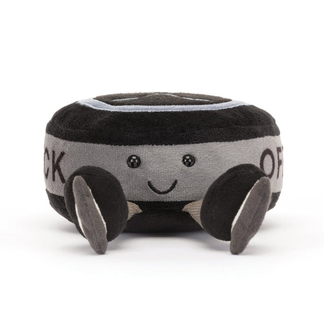 The Amuseables Sports Ice Hockey Puck is designed with gray and black plush. The top of the puck is embroidered with a pair of crossed hockey sticks and the words “Official Jelly Puck” circle around the sides. Also on the side of the puck, you will find a smiling face–a Jellycat signature! Two small legs that end in ice skates stick out from the bottom of the puck. The sitting puck makes the perfect decoration for an office, man cave, dorm room, or any sports-themed room. Amuseables Sports Ice Hockey Puck is a soft and safe gift for hockey-fans-in-training on birthdays and holidays!