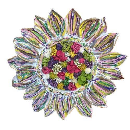 Carefully chosen one at a time, each tiny flower is affixed to this beautiful frame, which