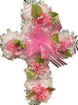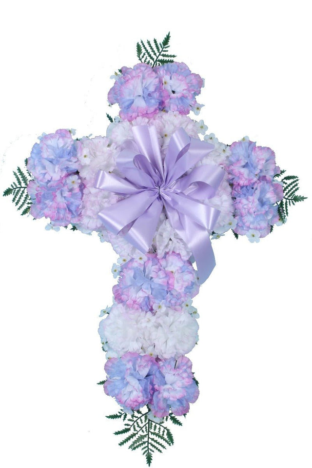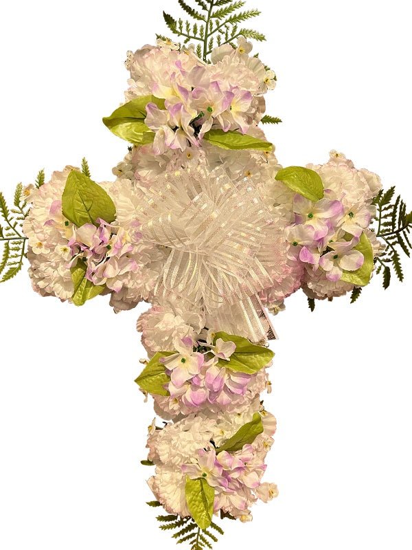 The Artificial Outdoor Memorial Cross is a sign of faith that won't fade away. Beautiful faux hydrangeas with colorful blossoms along with satin ribbon make this a a great value for any memorial gift to the grave.