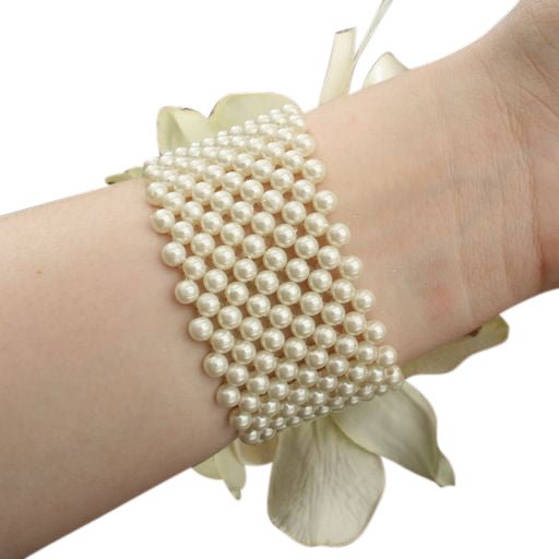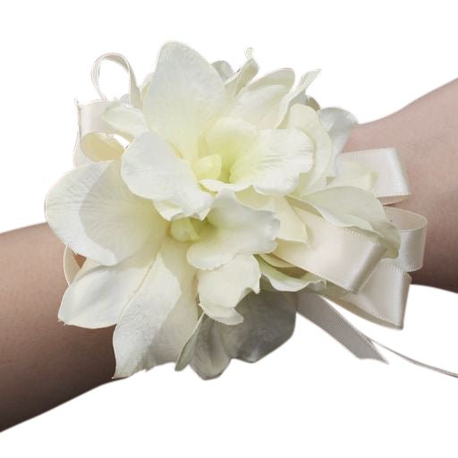 This neutral wrist corsage is made up of faux white orchids accented by white satin ribbon. The White Orchid Wrist Corsage stays securely on the wrist with a comfortable elastic band. Orchids fit in with many styles–from classic to modern–and an all-white design will never clash with your festive ensemble.