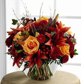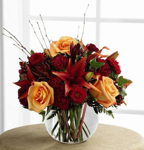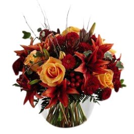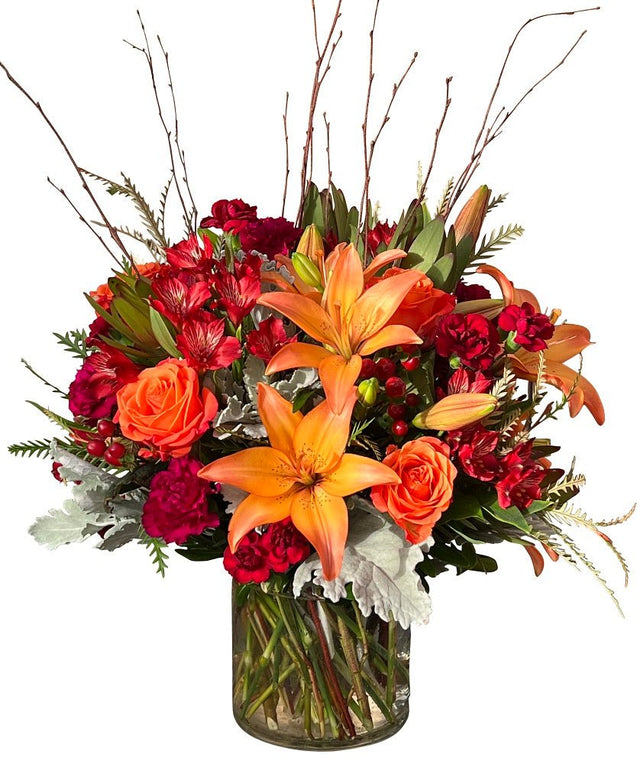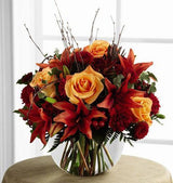 The Autumn Beauty Bouquet exudes the warmth and magnificence of the harvest season with each sun-kissed bloom. Orange roses are brilliant and bright against rust colored Asiatic lilies, burgundy carnations and mini carnations, red matsumoto asters, red hypericum berries, and a variety of lush greens. Accented with birch branches throughout, this incredible arrangement is seated in a clear glass vase to create an exceptional look your special recipient will love. Approx. 14H x 14W.