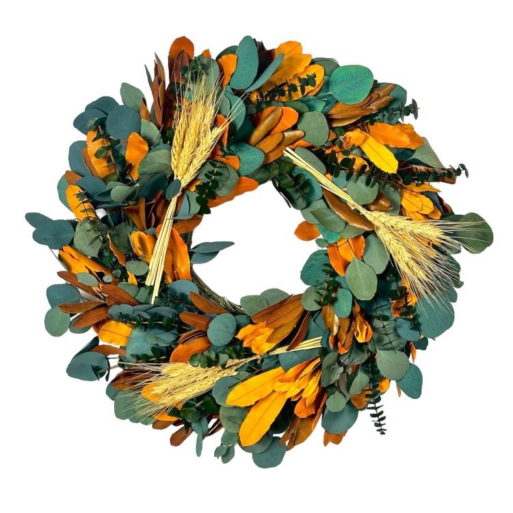Bunches of preserved wheat pop against a background of copper and dusty blue in the Autumn Garden Wreath. The preserved flower wreath can be displayed indoors or outdoors for a rustic, autumnal look.