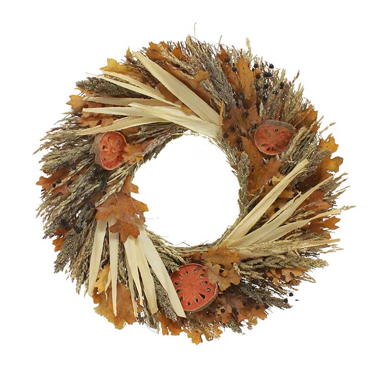 The Autumn Quince Wreath is made of natural dried materials including sorghum, Sudan grass, orange maple leaves, corn husk, black flax, and 3 natural dried quinces. The quinces are a unique pear-like fruit that is cut into a cross section to show their pretty seed pattern.