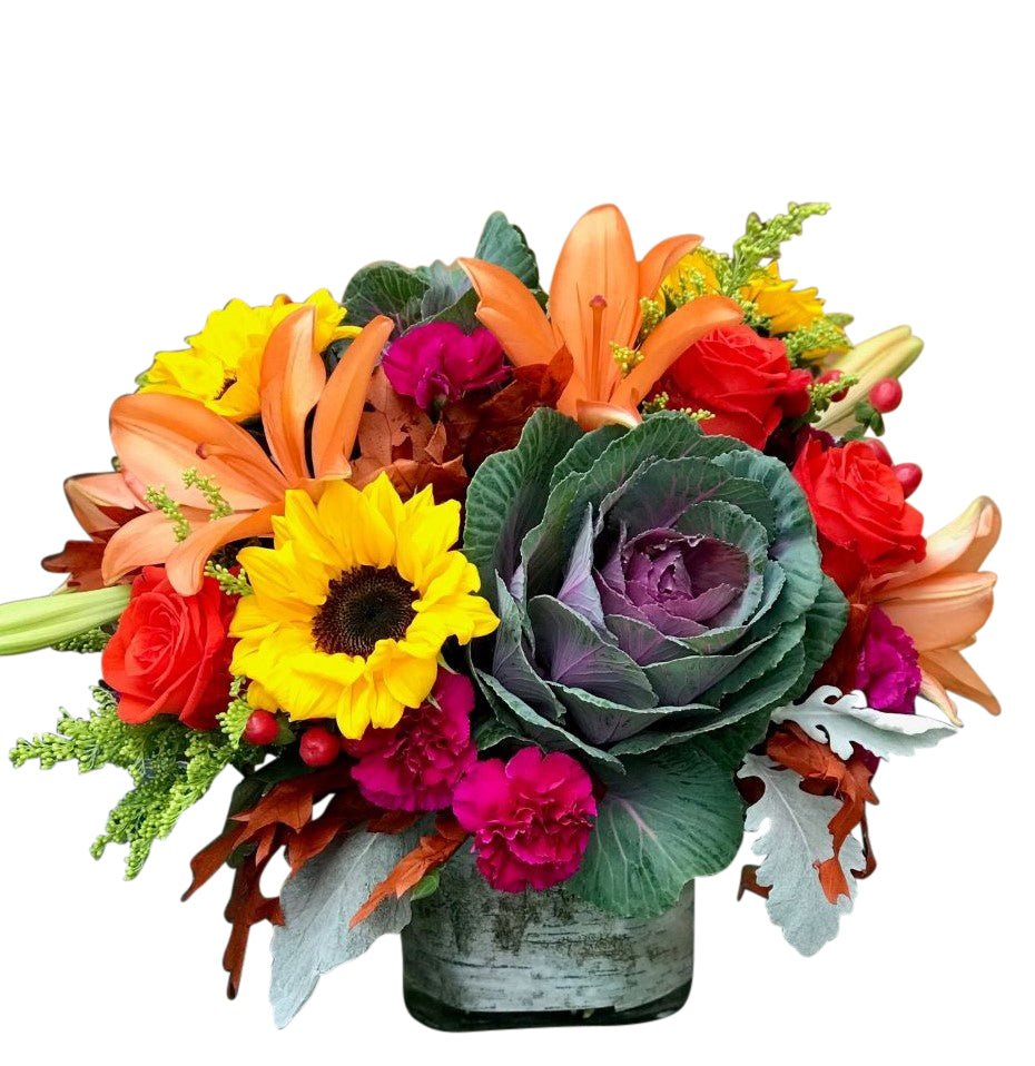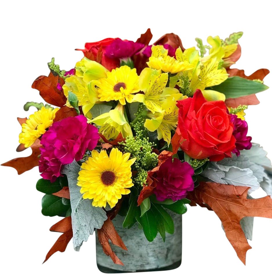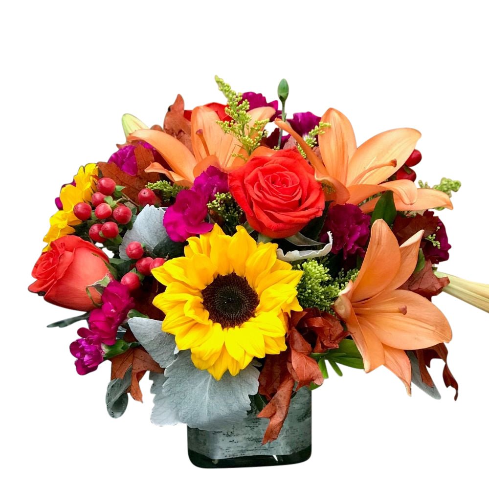 A stylish assortment of Fall colors arranged in a low glass cube. Perfect for any occasion, this arrangement provides a seasonal burst of flowers that fits nicely on an end table, bedside table or countertop! Flower varieties may include: