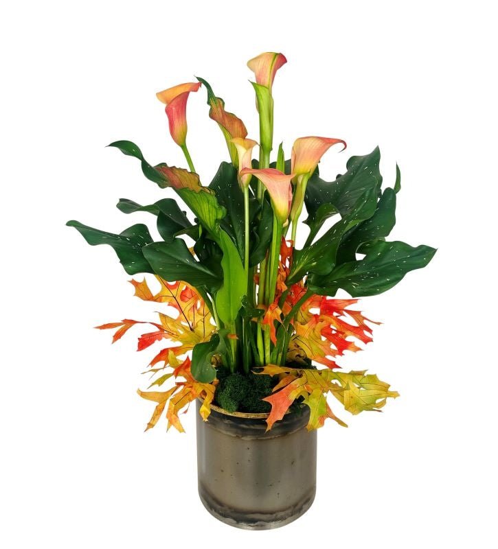 The Autumn Urban Calla is a unique twist, on everyone's favorite- Urban Calla! Fall season inspired, this exquisite creation features a thriving calla lily plant with a cylinder galvanized, metal pot. The designers added the perfect mix of an earthy, organic spanish moss and artificial fall leaves. The fall leaves lay elegantly beneath the blooms and foliage- just as the season's falling leaves cover the ground and hug outdoor plants. This symbol of fall refreshment and beauty is the perfect gift for any occasion this fall season as it incorporates the creativity and celebration of the fall season, while also bringing a comforting warmth of style and beauty. Available for delivery anywhere in the continental United States, this is definitely the go-to selection to embrace your recipient's love of plants, originality, and the fall season beauty!